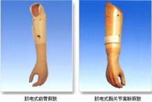 (5)肌電假肢:肌電假肢是一種由大腦神經(jīng)直接支配的外動(dòng)力型假肢。它是精密機(jī)械、微電于技術(shù)、材料科學(xué)和生理醫(yī)學(xué)等現(xiàn)代高科學(xué)技術(shù)的產(chǎn)物。這種假肢的控制系統(tǒng),是由大 腦神經(jīng)支配肢體肌肉收縮產(chǎn)生運(yùn)動(dòng)時(shí)發(fā)出肌電信號(hào),傳達(dá)到皮膚表面,控制系統(tǒng)接受信號(hào)后驅(qū)動(dòng)微型電動(dòng)機(jī)產(chǎn)生動(dòng)作。它一般可以完成手指伸屈、手腕伸屈、手腕內(nèi)外旋轉(zhuǎn)三組動(dòng)作.它使用時(shí)直感性強(qiáng),仿生效果好,是現(xiàn)代假肢的發(fā)展方向,適用于前臀部分缺損的殘疾者。
